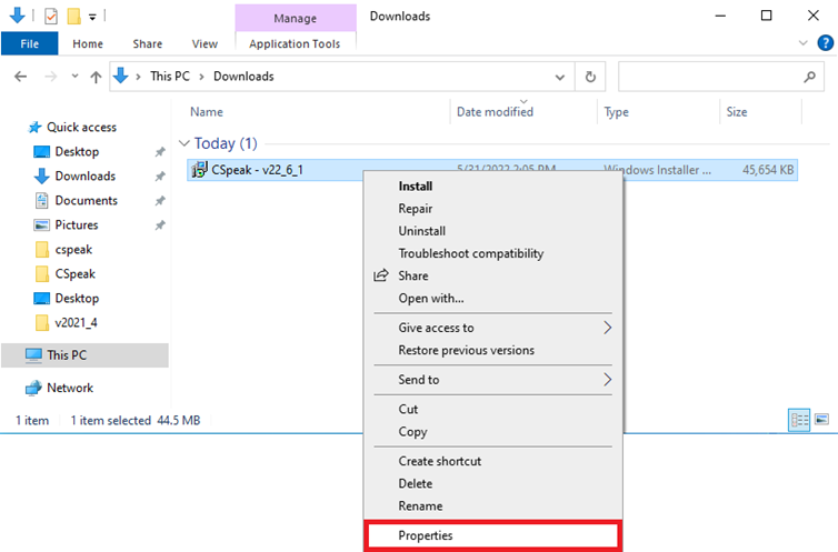 Once you have downloaded the installation package, please open Windows explorer and navigate to the downloads folder. Locate the downloaded installation package and right click on it. Select properties from the context menu shown on screen.