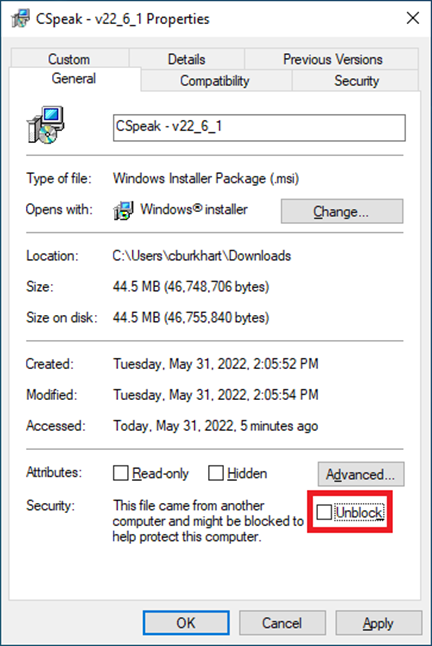 Once the properties window appears please check the unblock checkbox and click apply and ok.