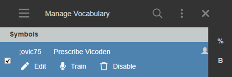 To modify a vocabulary entry all you must do is click on it. You will be presented with 3 options. The ability to edit the entry, the ability to train the entry, and the ability to disable the entry.