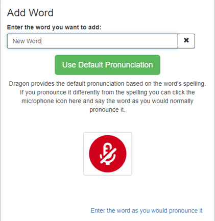 If the word is more complicated or if the user has a strong accent, they can try the record option or the option to, “enter the word as you would pronounce it”. If you choose the option to enter the word as it is pronounced, please keep in mind that you should enter the pronunciation form as it is pronounced. For example, the word, “IEEE”, would be pronounced, “I triple E”.