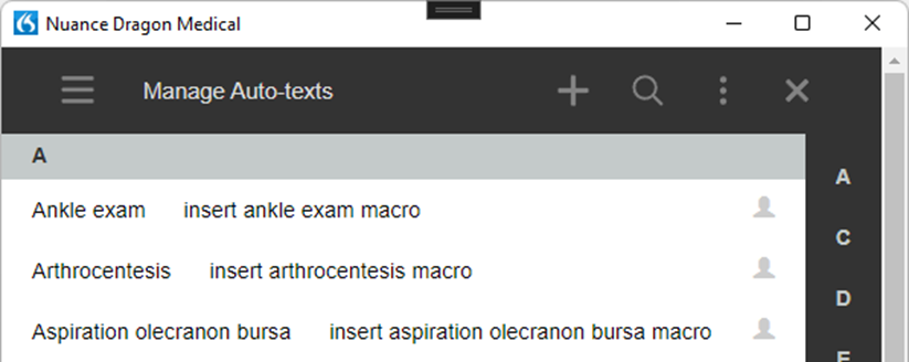 This content page will allow you to create and manage the list of auto-texts that you have in your account. You may also see some auto-texts that are owned by your organization. These auto-texts will not be editable in this editor. Any organization owned auto-texts must be managed in the Nuance Management Center.