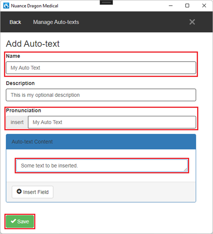 On the add auto-text content page please insert the name, spoken phrases (aka pronunciation), and content for the auto-text. Optionally you can include a description for the auto-text. When you have completed the data entry, please click the save button.