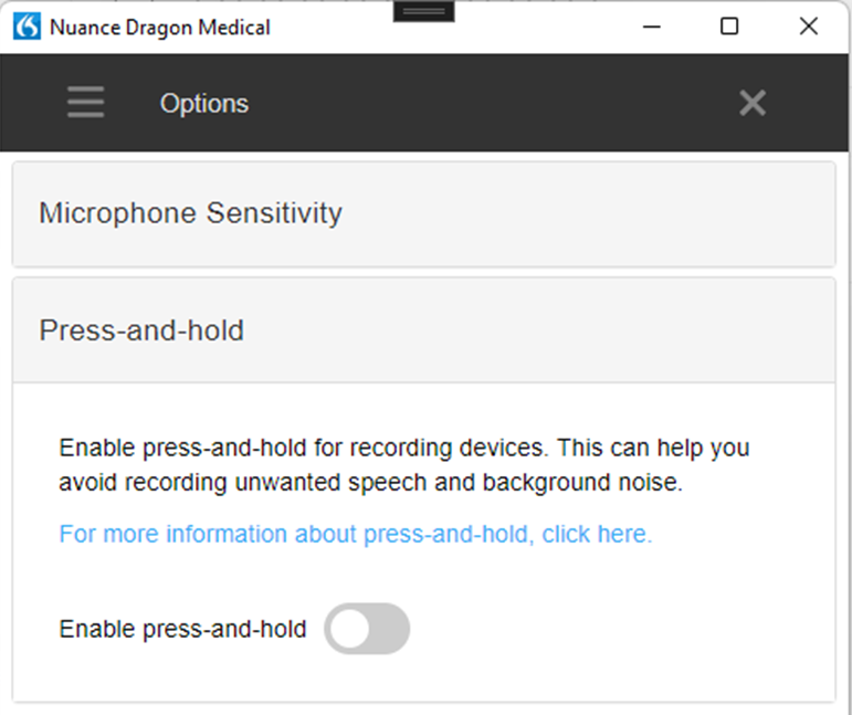 This content page allows you to modify some of the functionality of your microphone. Currently the two available options are the microphone sensitivity and to enable press-and-hold recording. It is strongly recommended that you do not alter the microphone sensitivity unless directed by your support resource. Press-and-hold is available for providers who prefer that style of dictating as compared to the traditional press-to-toggle recording style.