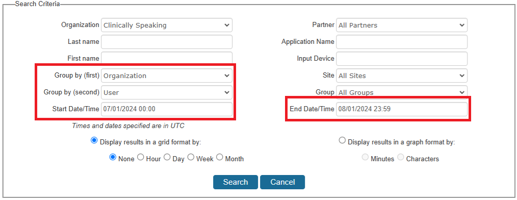 Select a date range and the options by which you would like to sort the report. For example, to create a usage report that displays users for the month, select the month you want to view and then sort by Organization (first) and User (second). Click Search.